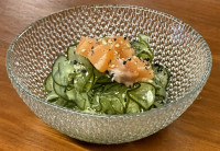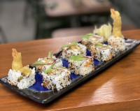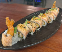 8 UNIDADES DE URAMAKI DE CAMARÃO EMPANADO NA MASSA PANKO, RECHEIO DE PEPINO FINAMENTE CORTADO E ABACATE, COBERTO POR SALMÃO MAÇARICADO E MOLHO PICANTE AGRIDOCE.