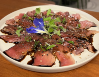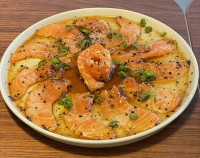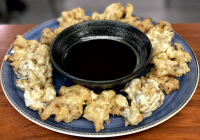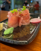 De 03 a 05 unidades de tempurá de camarão, envoltos com lâmina de salmão e leve toque de cream cheese, tudo maçaricado e finalizado com molho artesanal “tarê”