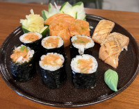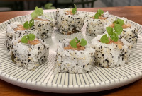 Sushi com arroz por fora e algo na parte interna, com salmão assado com leve toque de cream cheese. CONTÉM LACTOSE.