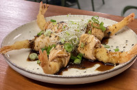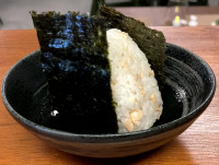 Tradicional da região de Nagoya, oniguiri com recheio de tempura de camarão com molho Tarê da casa.