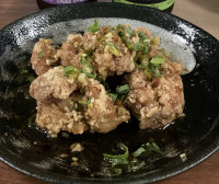 05 bolinhos de arroz fritos, com salmão batido levemente temperado e apimentado