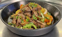 Contra filé ou Alcatra com legumes, tipos de pimentão e cebola, com tempero coreano levemente adocicado.