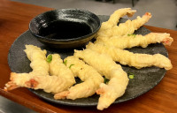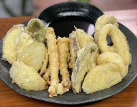 Camarões, lula e legumes da época fritos da maneira tradicional japonesa.