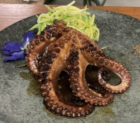 Polvo cozido no tempero oriental cortado em rodelas, com conserva coreana de acelga picante.