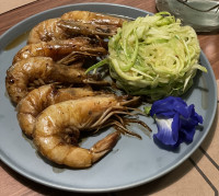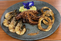 Um polvo P, camarōes e anéis de lula grelhados. Acompanha espaguete de abobrinha.