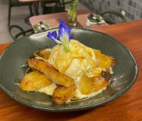 Banana flambada no licor espanhol Macieirae calda de laranja artesanal, acompanha 1 bola de sorvete de creme Bali.