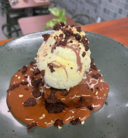 Brownie artesanal com calda de chocolate e 1 bola de sorvete de creme Bali. Pode conter castanha de cajú ou nozes. Por favor, se informe com o garçom.