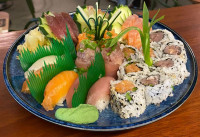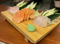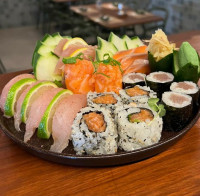 32 PEÇAS VARIADAS DE 3 PEIXES, SALMÃO, ATUM E PEIXE BRANCO DO DIA, COM SASHIMI, NIGURIZUSHI E MAKIMONO. ACOMPANHA 2 DRAGONS E SUSHI E SASHIMI DE POLVO.