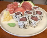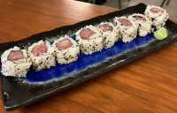 8 UNIDADES DE URAMAKI DE TEMPURÁ DE CAMARÃO , LEVE TOQUE DE CREAMCHEESE PHILADELPHIA, PEPINO E ABACATE, COBERTO POR SALMÃO CRU E MOLHO DA CHEF.