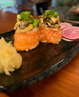 Sushi com arroz por fora e algo na parte interna, com salmão fresco batido.