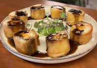 8 UNIDADES DE SUSHI DE SALMÃO, CREAMCHEESE E ARROZ, ENVOLTO EM MASSA DE HARUMAKI.