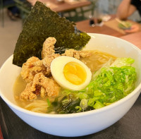 LAMEN COM CALDO A BASE DE FRANGO E PASTA DE SOJA TEMPERADA PELA CHEF, COM FINAS FATIAS DE CHYASHYU, QUE É CARNE DE PORCO COZIDA E MAÇARICADA. ACOMPANHA ALGA WAKAME, OVO COZIDO, CEBOLINHA E LEGUMES SALTEADOS.